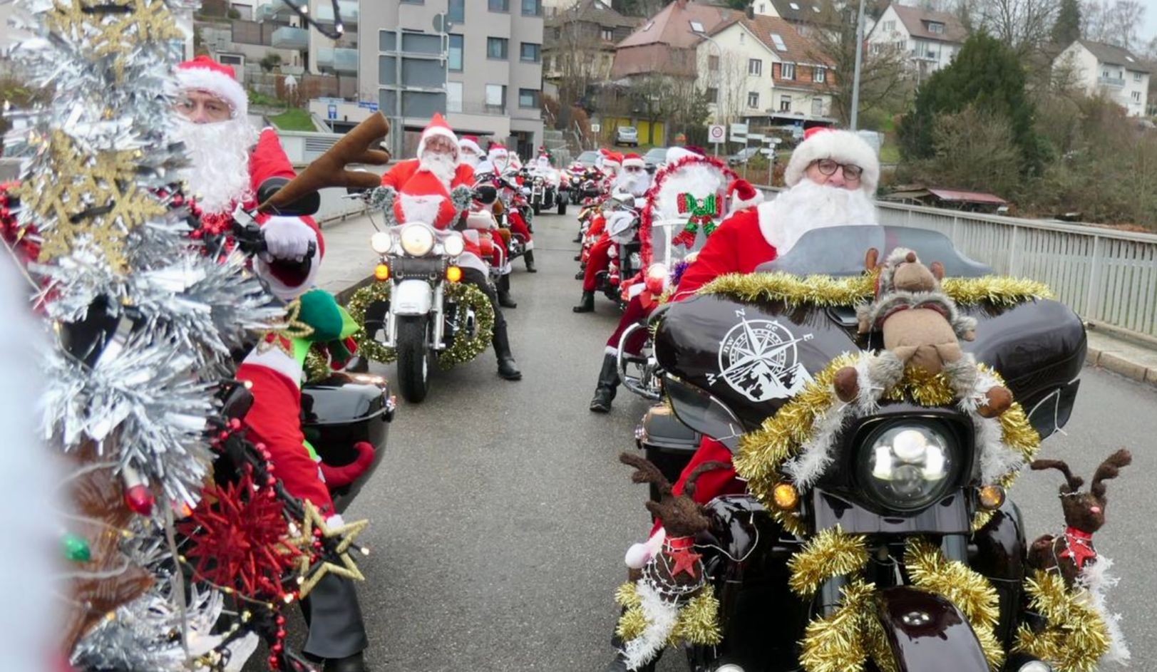 Tapfere 20 Nikoläuse machten sich bei regnerischem Wetter auf nach Bad Bellingen um im Kurpark Kinder und auch Erwachsene mit ihren geschmückten Maschinen einen Freude zu bereiten, Päckchen zu verteilen und für die Aktion Spenden zu sammeln.